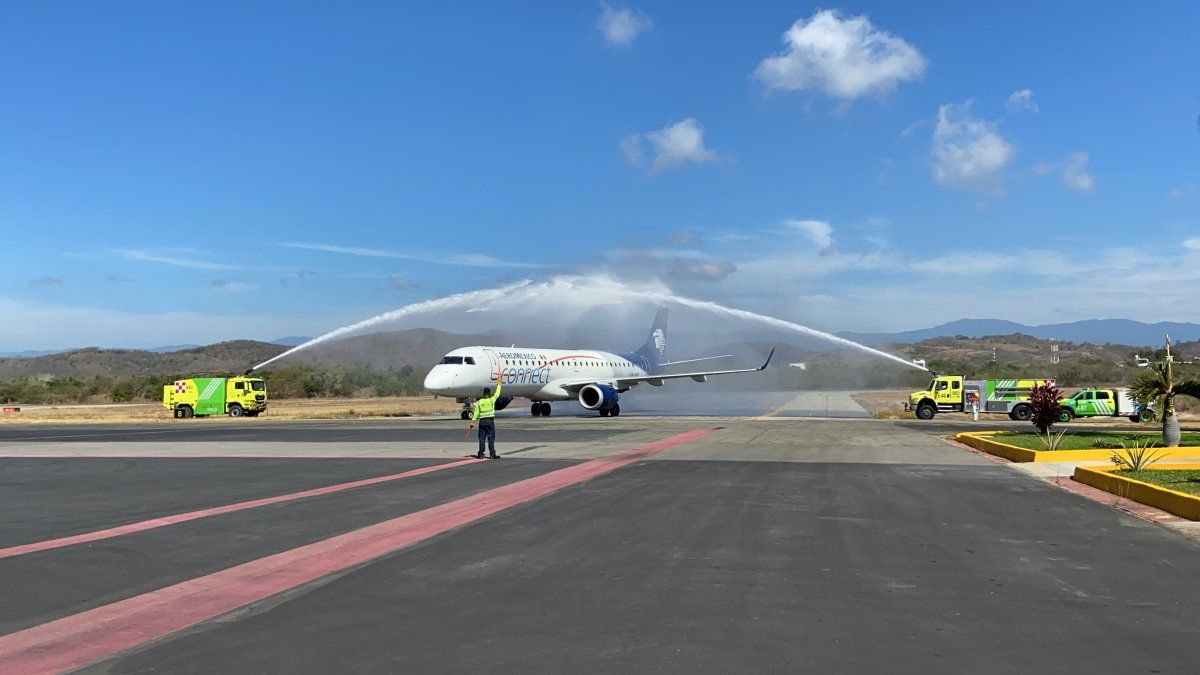 Para celebrar la llegada del primer vuelo de Aeroméxico en la nueva ruta Ciudad de México-Puerto Escondido, las autoridades del estado de Oaxaca y de Aeropuertos y Servicios Auxiliares (ASA), recibieron al avión con el tradicional baño de agua. La aerolínea operará con siete vuelos semanales a este destino.