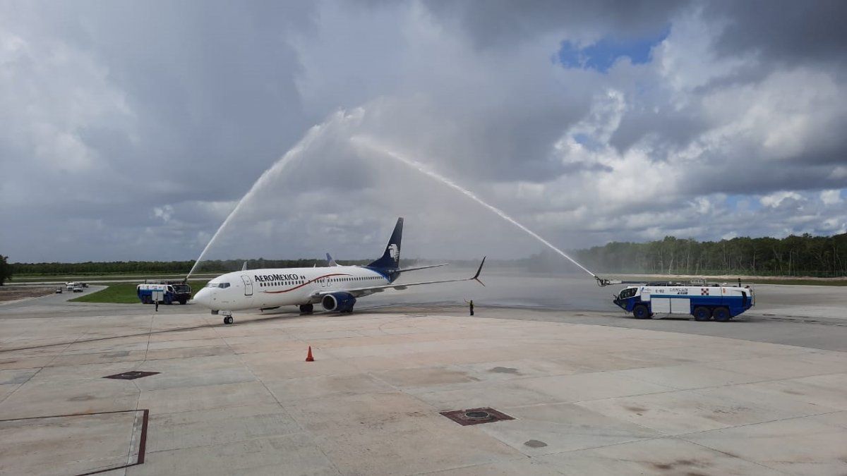 Con motivo de la llegada del primer vuelo de Aeroméxico en la nueva ruta Guadalajara–Cancún, los ejecutivos del Grupo Aeroportuario del Sureste (ASUR), recibieron al avión con el tradicional baño de agua, para celebrar la nueva ruta que iniciará con siete vuelos semanales.
