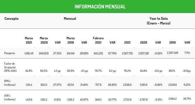 Los números de Viva Aerobus en marzo de 2021.